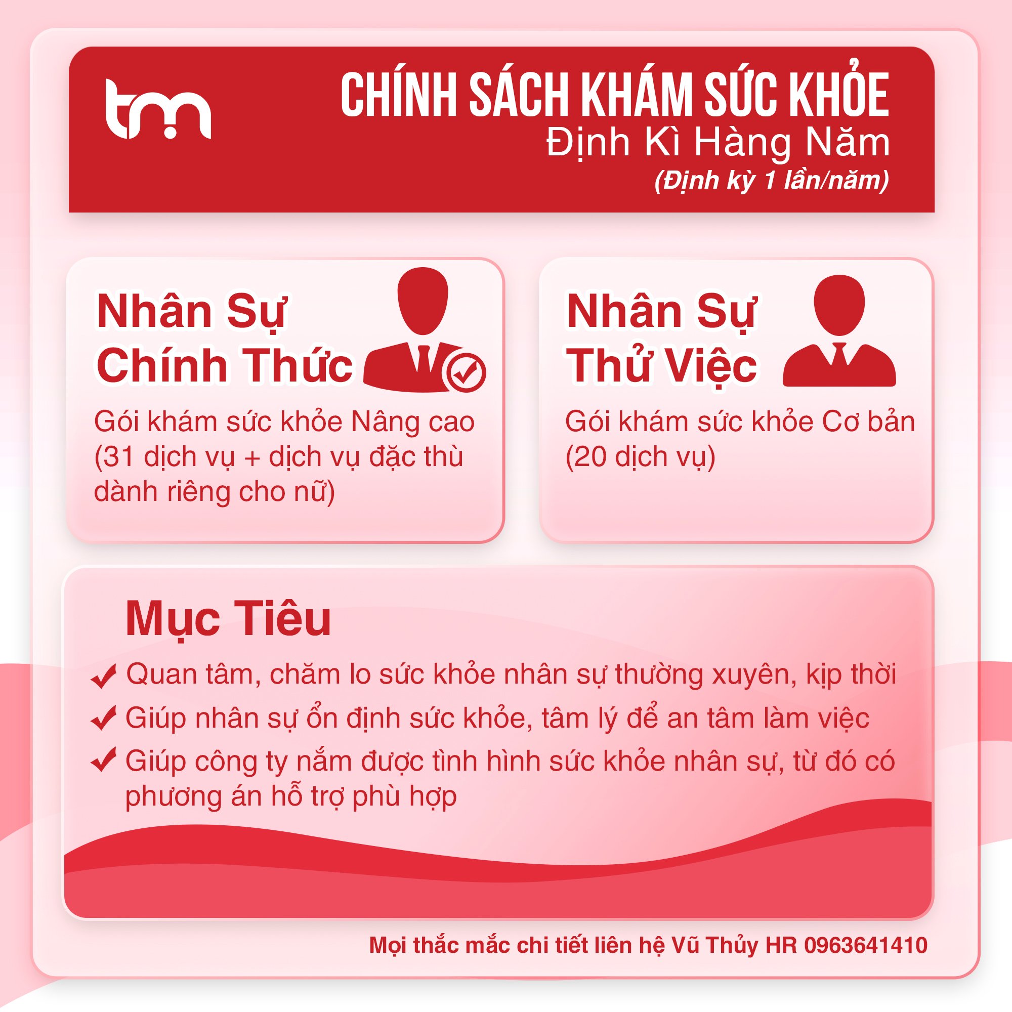 Cùng với chính sách về lương thưởng, bảo hiểm,… chế độ sức khỏe là một trong những ưu tiên hàng đầu của Ban Giám đốc để giúp nhân sự ổn định tâm lý, sức khỏe yên tâm làm việc & giúp công ty nắm được tình hình sức khỏe của người lao động để có những phương án hỗ trợ phù hợp. Vì vậy, CHÍNH SÁCH KHÁM SỨC KHỎE ĐỊNH KỲ HÀNG NĂM đã được áp dụng.